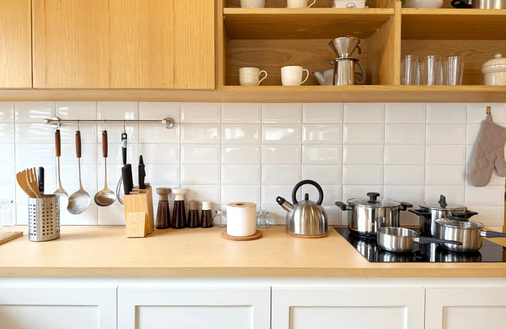 ลองเปลี่ยนมาแขวนตะหลิว ทัพพี หรือเขียงไว้บนผนังกันเปื้อน (Backsplash) แทนการยัดเก็บในลิ้นชัก วิธีนี้ช่วยประหยัดพื้นที่เก็บบนเคาน์เตอร์ และทำให้หยิบจับอุปกรณ์มาใช้งานได้ทันที