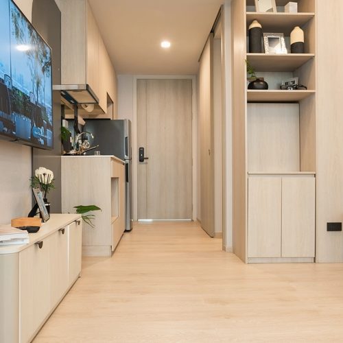 สะอาด กว้างข้างดูเพิ่มความน่าอยุ่ในกับห้องที่มีเนื้อที่จำกัด ไม้สีธรรมชาติให้ความรู้สึกเข้ากันได้ดีกับสไตล์การตกแต่งห้องแบบโมเดิร์น เข้ากันได้ดีกับผนังห้องสีขาว และพื้นไม้สีเบจ